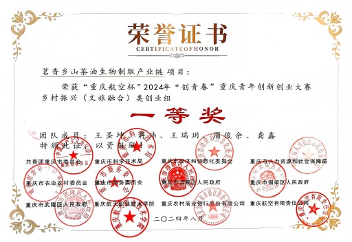 茗香乡山茶油企业由两名正高级工程师创办。其中王友国是农业推广研究员,重庆市科技特派员,获得重庆市科学技术奖科技进步二等奖,2022年被授予“全国绿化劳动模范”称号;王圣坤是纳米材料正高级工程师,也是重庆市林业科技特派员,荣获陕西省科学技术奖技术发明一等奖、“重庆航空杯”2024年“创青春”重庆青年创新创业大赛乡村振兴类创业组一等奖。